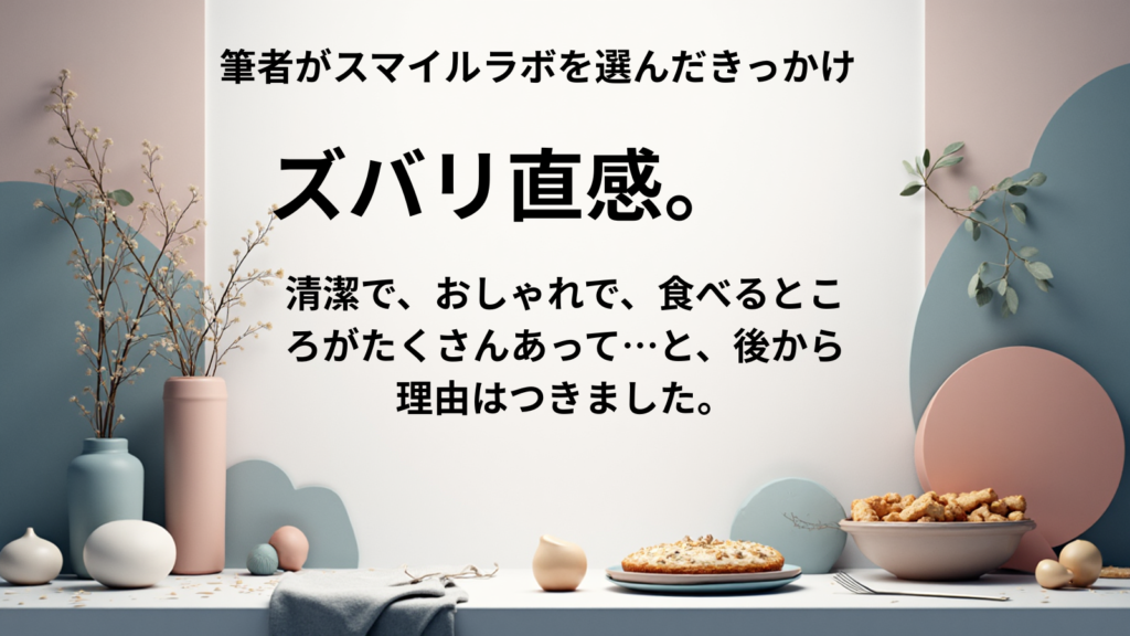 筆者がスマイルラボを選んだきっかけズバリ直感。 清潔で、おしゃれで、食べるところがたくさんあって…と、後から理由はつきました。